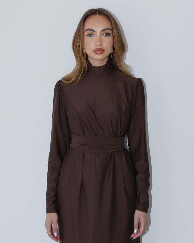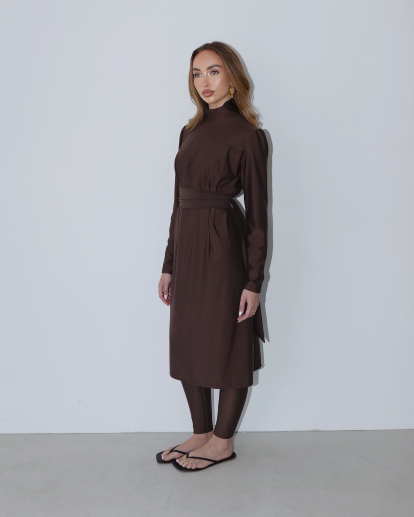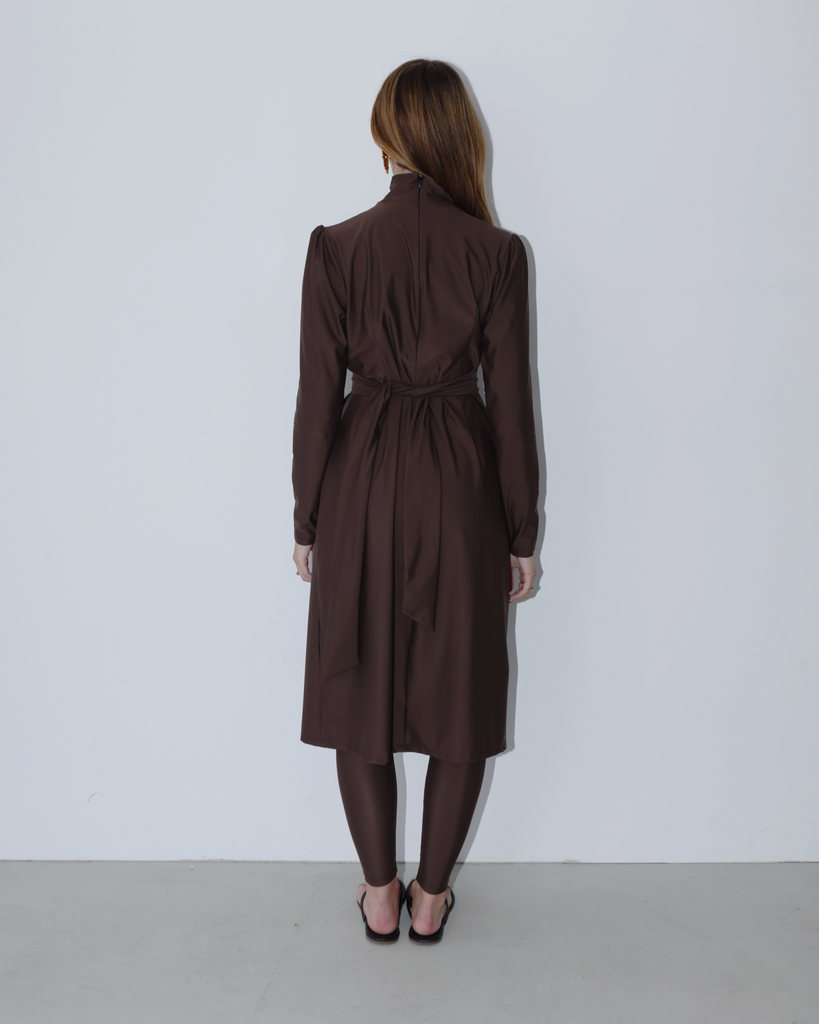 An ode to stillness beneath open skies. The Signature Midi Tunic in Carob captures the essence of Daylight Ease — where form flows freely and elegance feels unspoken. The soft drape of its princess silhouette moves with quiet rhythm, while gathered shoulders lend a touch of gentle structure. A high neckline frames the face with grace, and a removable belt invites versatility — cinched for contour, or left undone for the ease of the horizon.