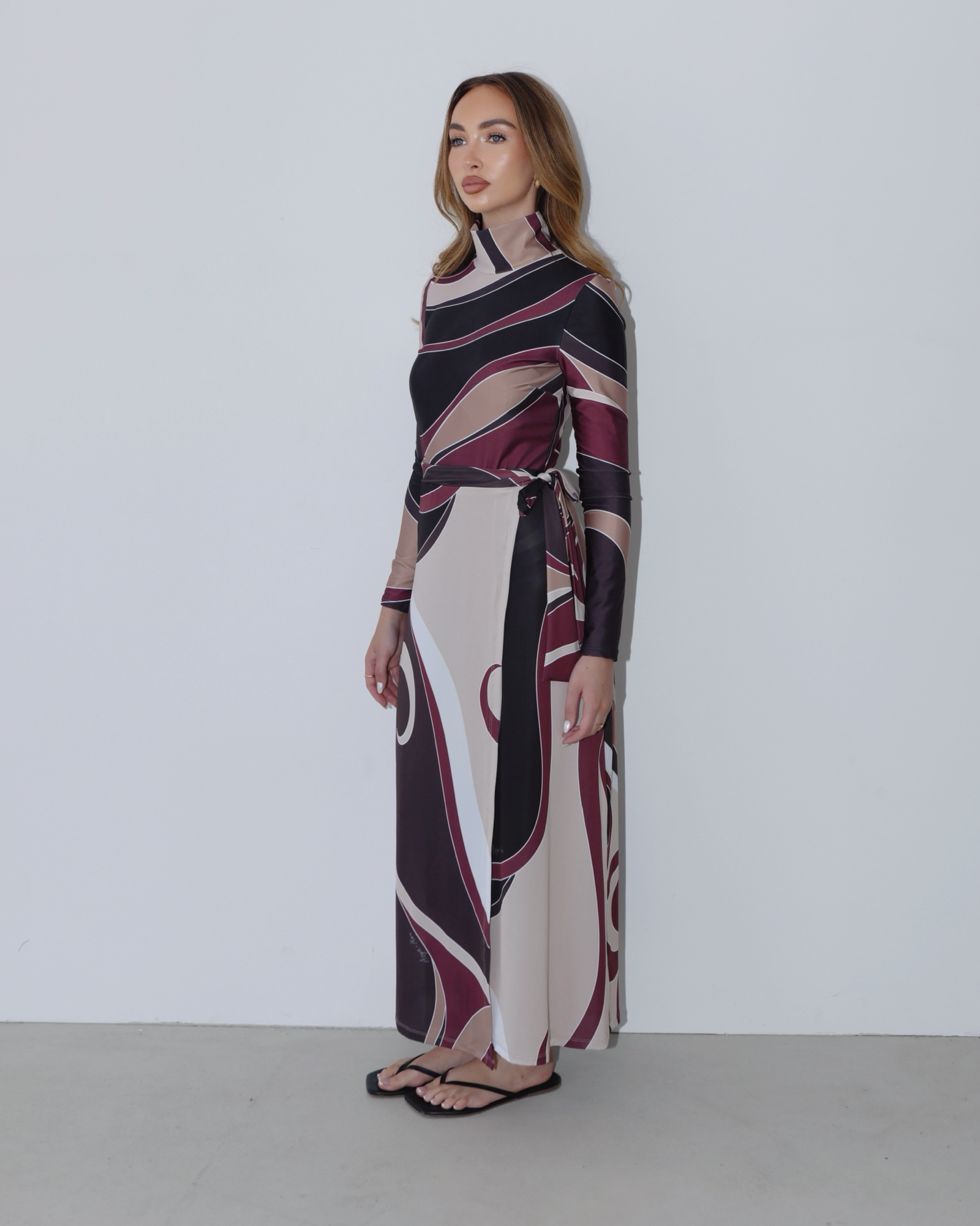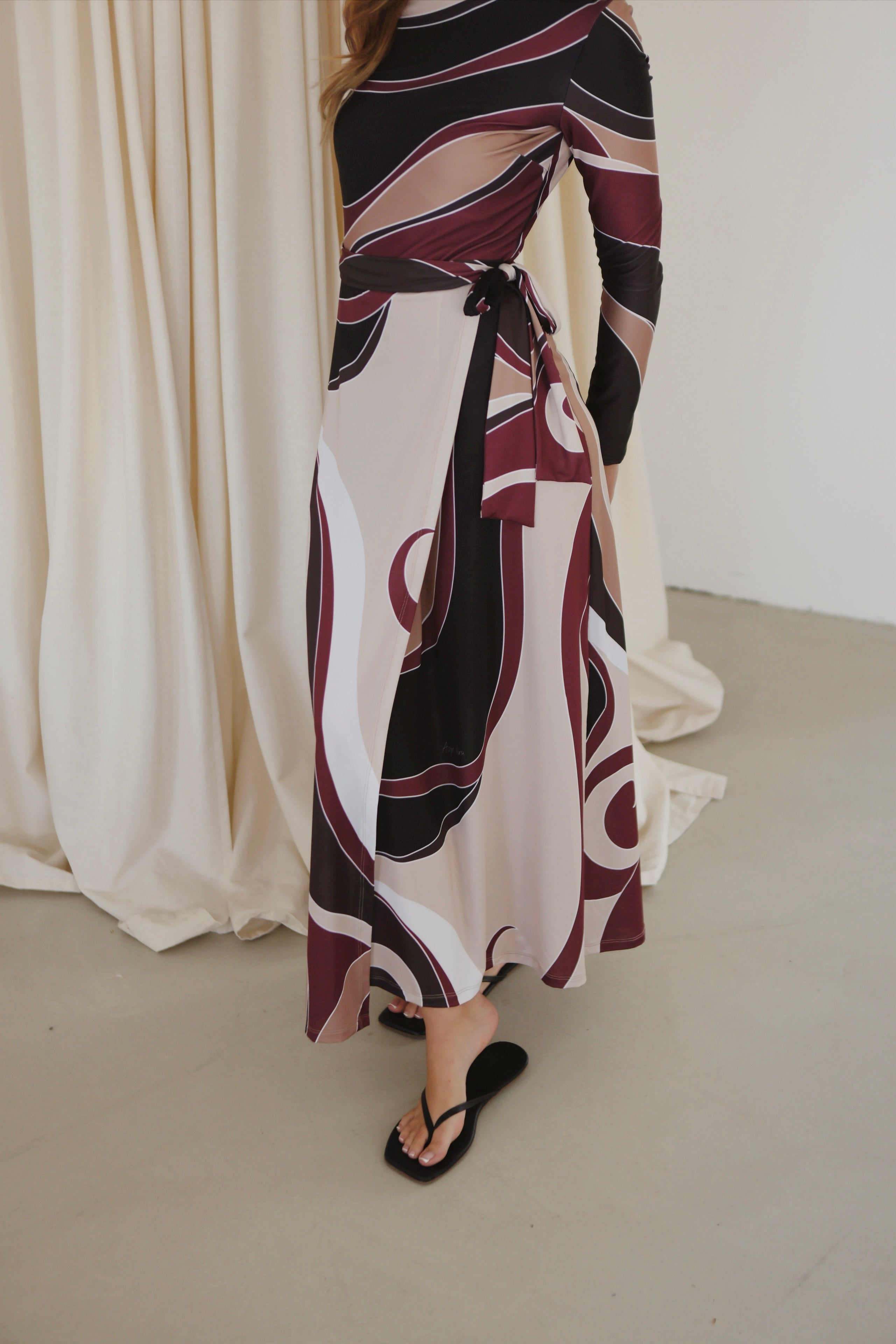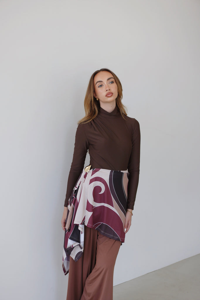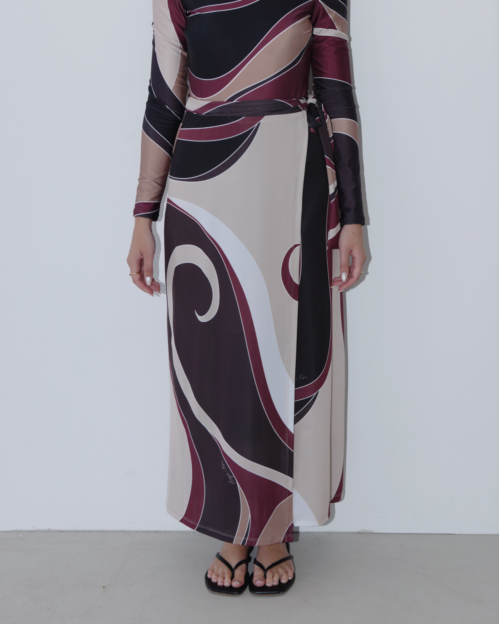 As part of the Afternoon Glow collaboration between AZYÄ and Mira The Label, AZYÄ’s understated outlook is channelled through the Isla Wrap Sarong. Intentionally designed to complement the Isla Bodysuit, it layers effortlessly for a polished, sun-to-sunset look. Crafted from sustainable stretch swim fabric, it secures with ties at the high-rise waist before falling to an asymmetric hem, creating a fluid, elegant silhouette.